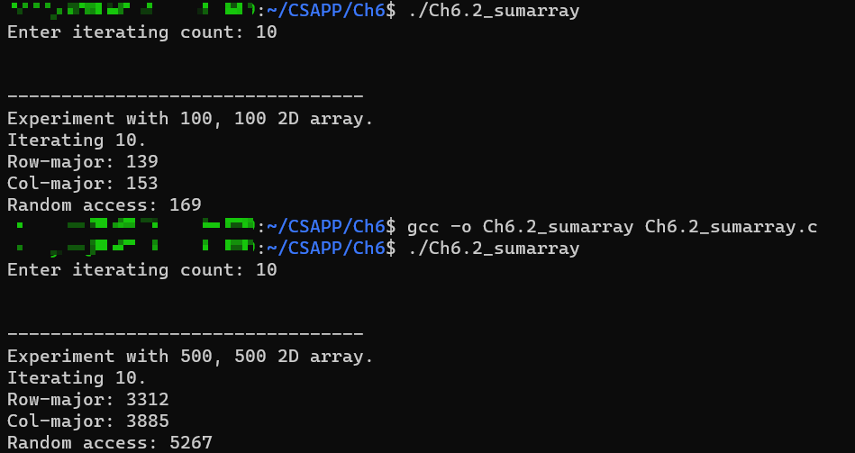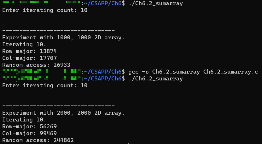 또한, random 방식이 column-major보다 더 오래 걸리는데, 그 이유는 column 방식도 아주 부분적으로는 locality를 활용하고 있기 때문이다. 같은 column에 대해 row를 순차적으로 접근하므로 여기서 일부 locality를 활용할 여지가 있기 때문에, 아예 무작위로 접근하는 random 방식보다는 더 빠르게 측정되었다.