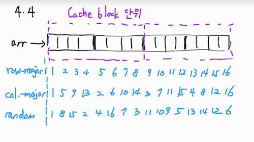 이 때, row-major는 spatial locality를 최대로 이용하는 접근 방식이다. 하나의 캐시 블록에서 첫 번째 요소에서만 miss가 발생하고, 그 다음 요소부터는 이전에 캐시에 저장해둔 블록에 접근할 수 있으므로 hit이 발생하여 효율적으로 캐시를 활용할 수 있다.